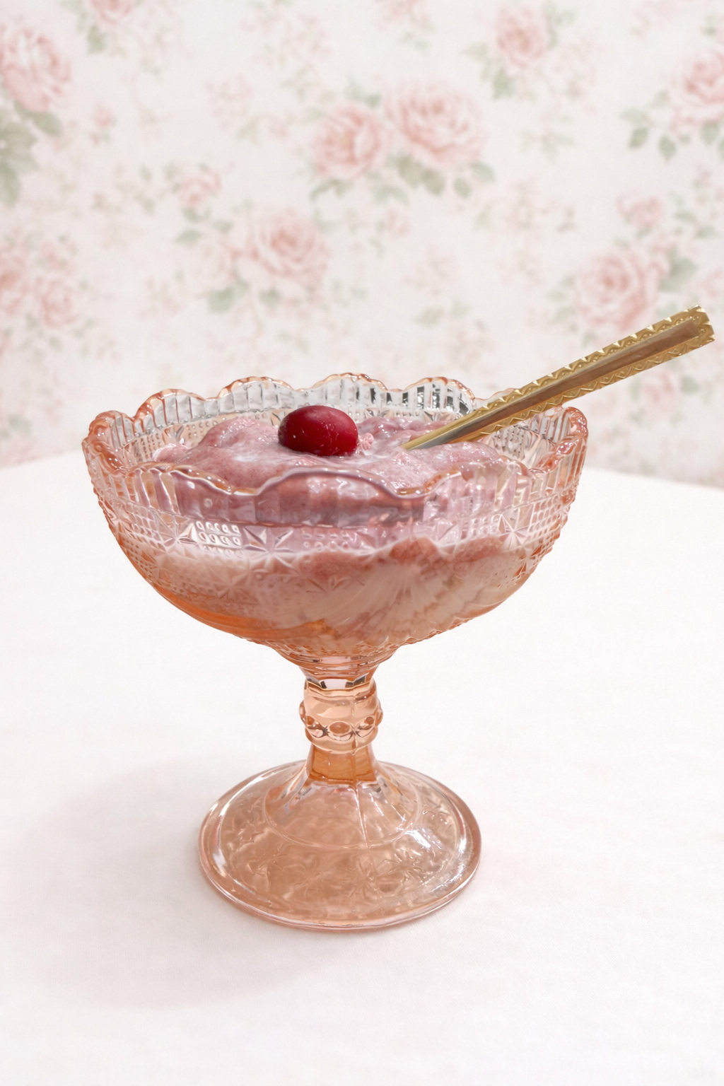 Õrnroosa, pitslise mustriga pressklaasist jalaga kauss, suhkru hoidmiseks või magustoidu serveerimiseks
