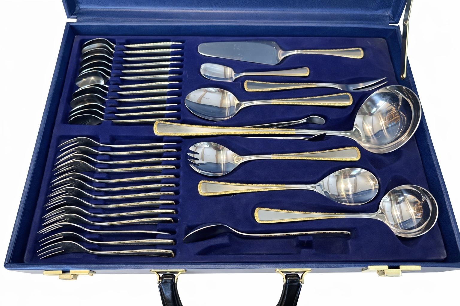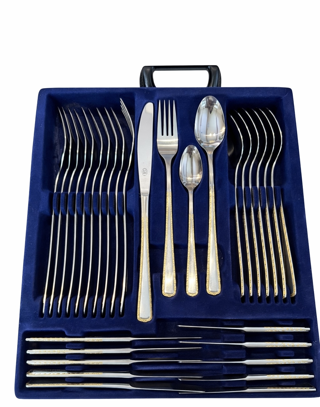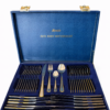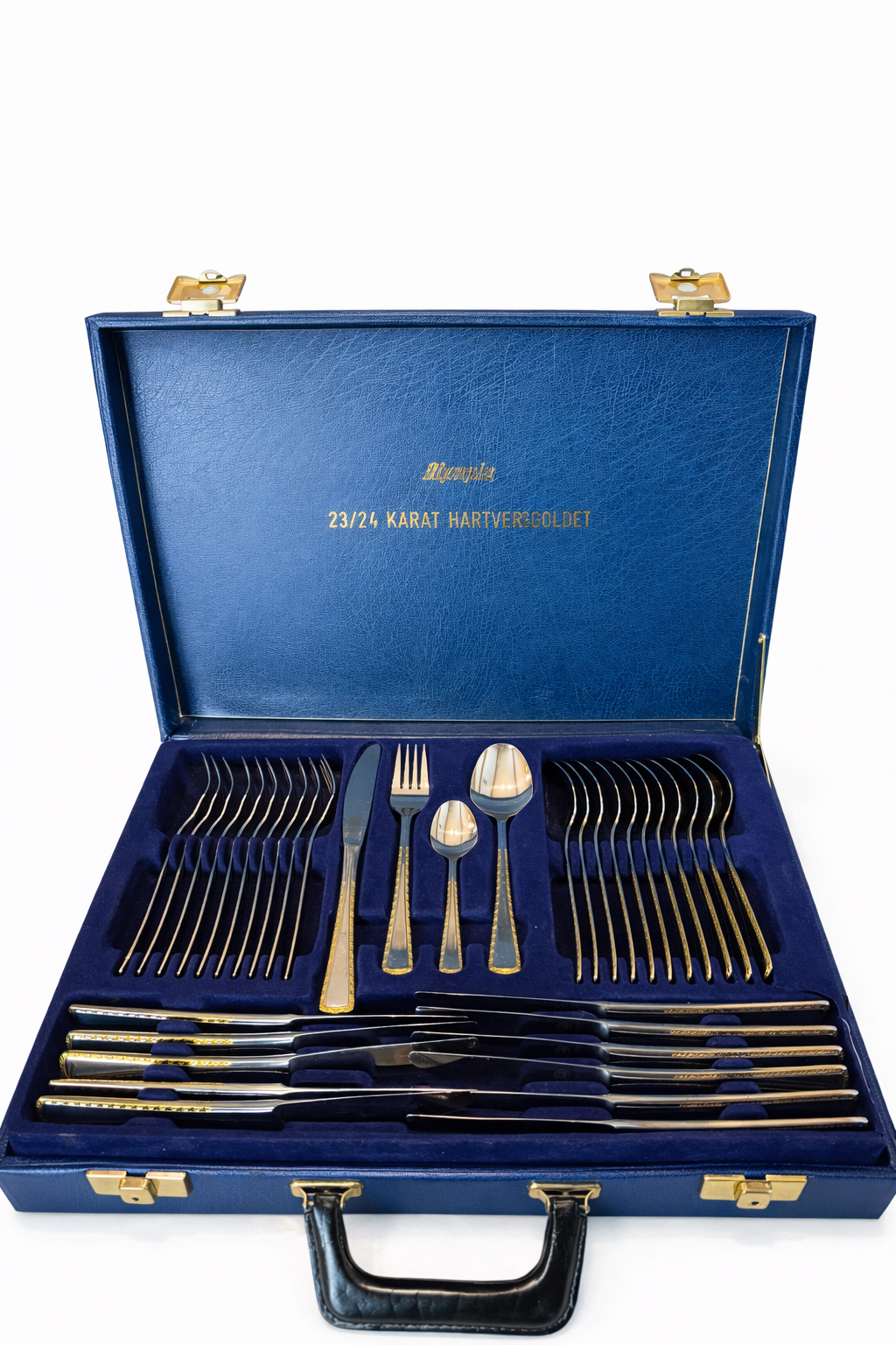 24 karaadise kullatisega, roostevaba 68-osaline Solingen Olympia söögiriistade komplekt kohvris