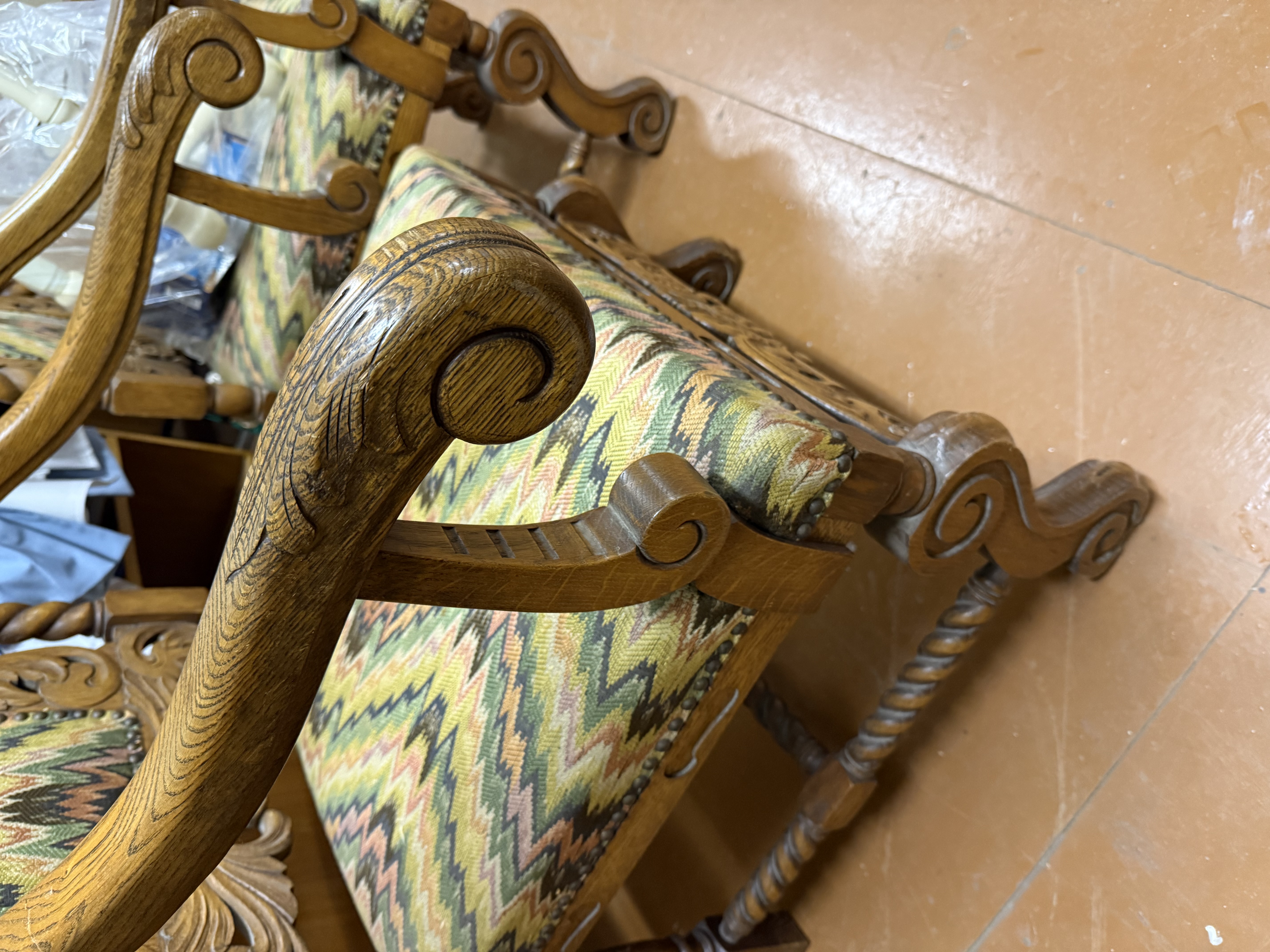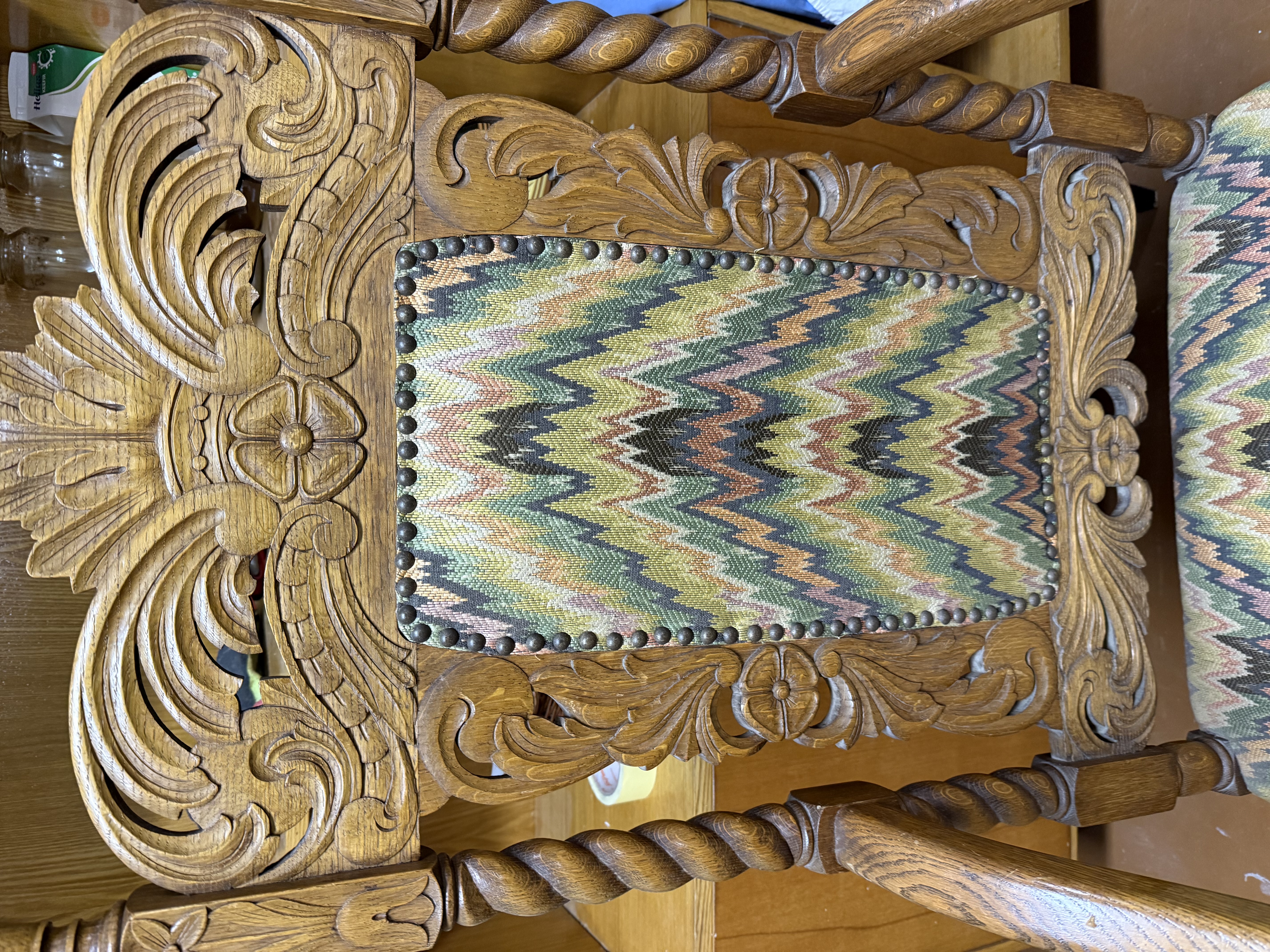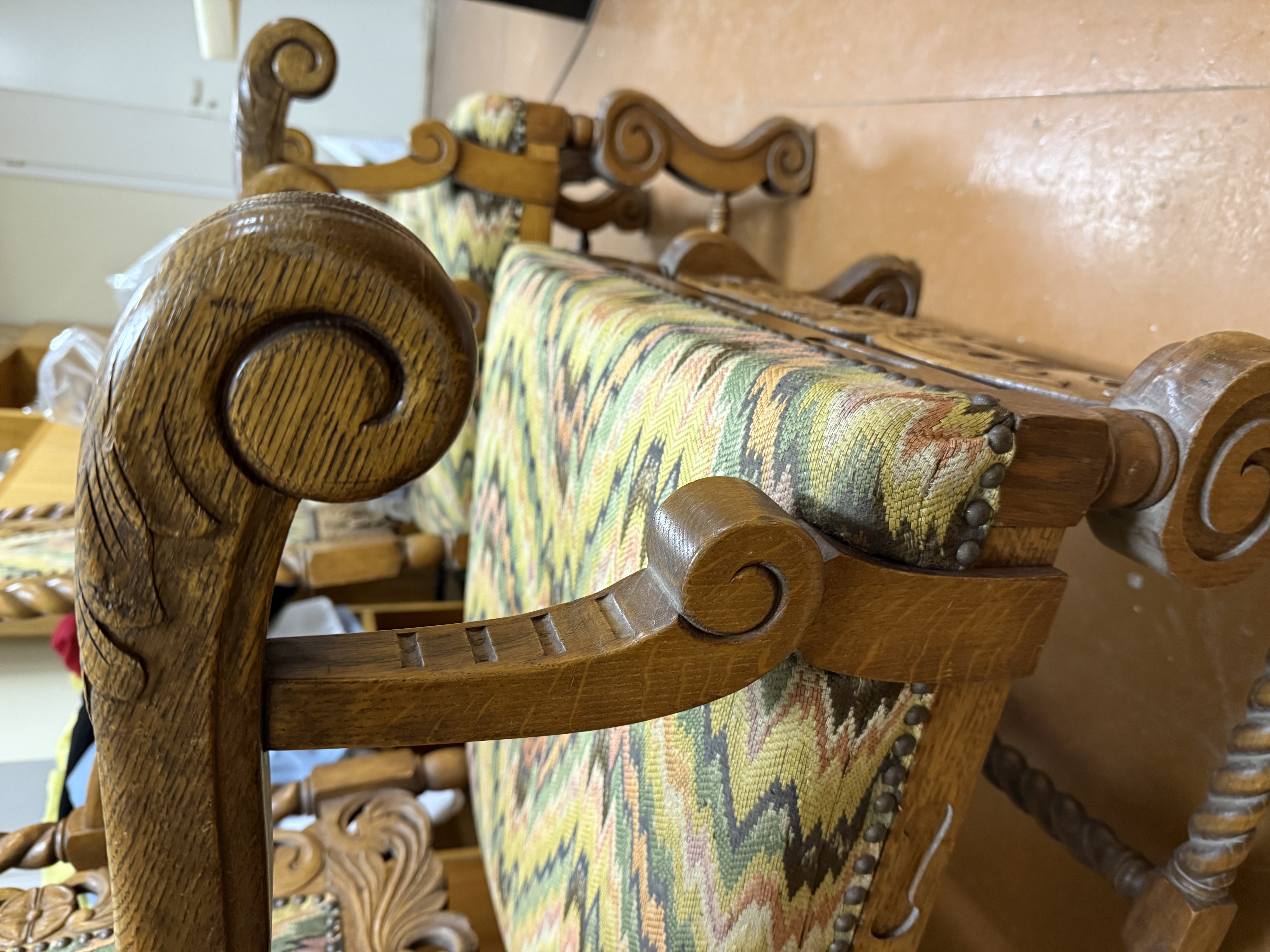 Antiikne, tammepuust, nikerdustega suur ja raske, nn. kirjutuslauatool